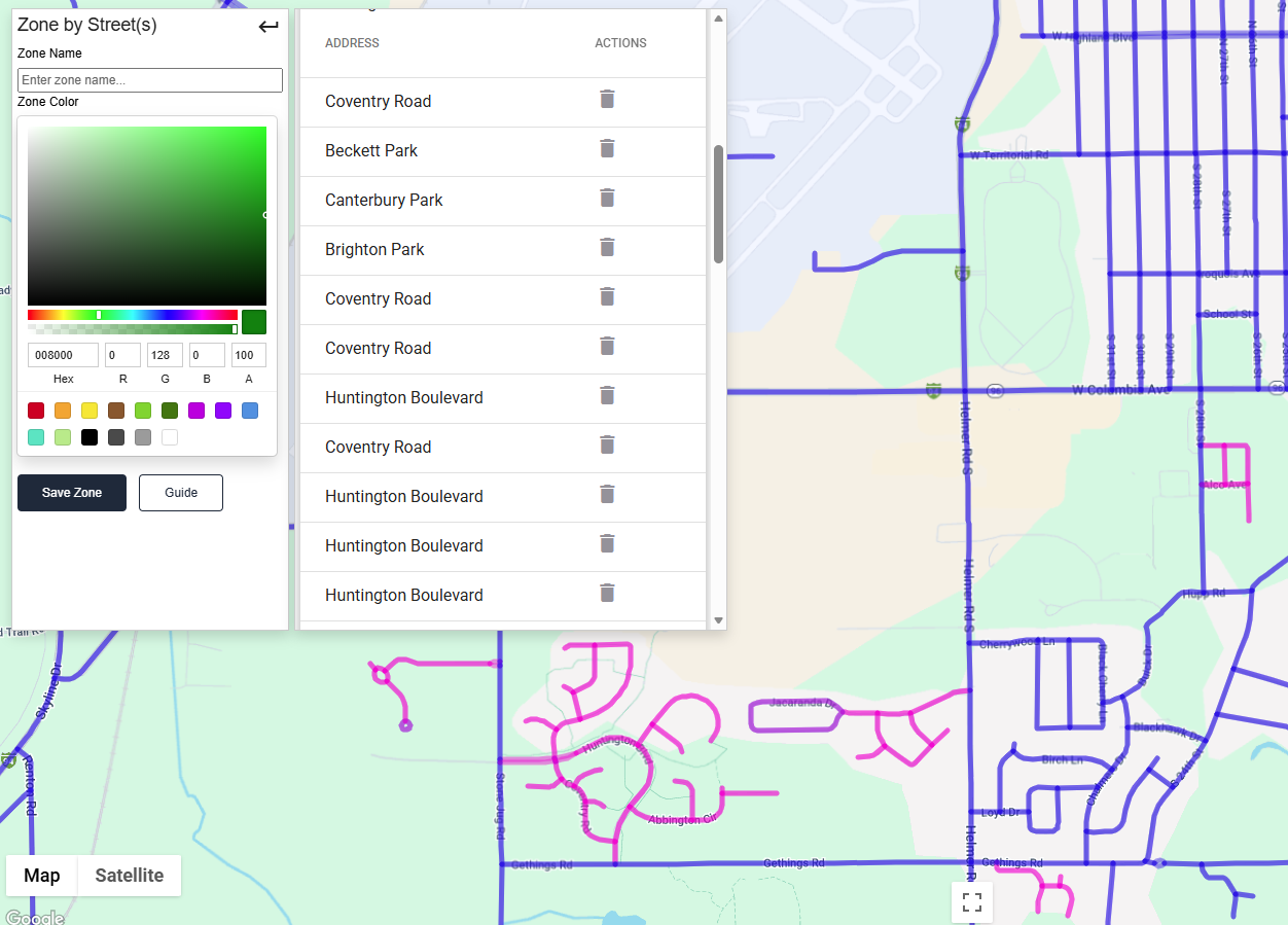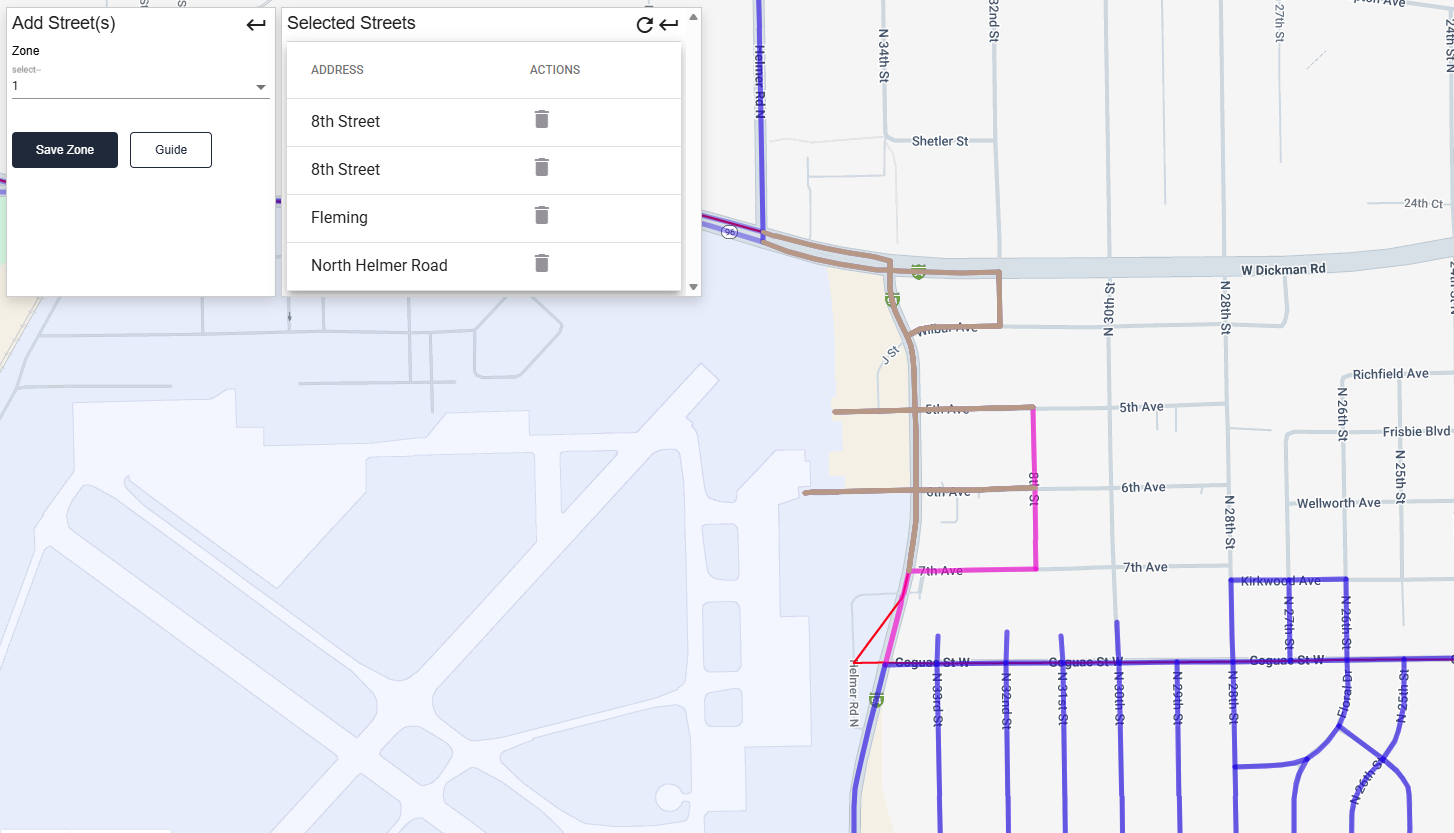 - Clicking on a blue street will turn it pink and add it to the selected zone.