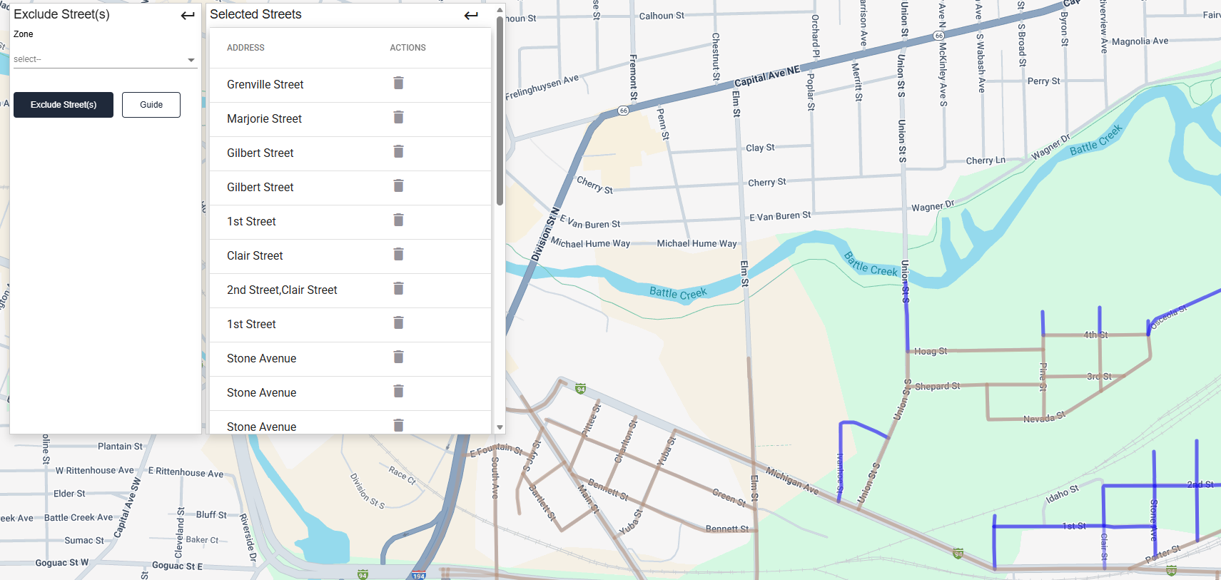 - Note: You can remove accidentally selected streets using the Trash Can next to the corresponding street name in the left-side list.