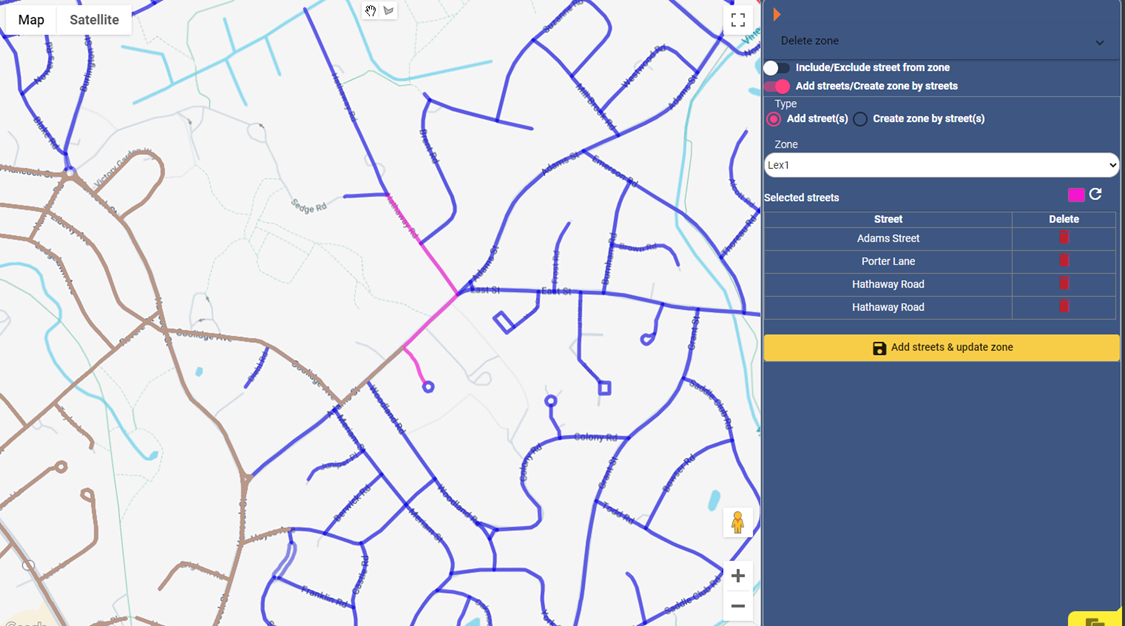 - Streets already in the zone will appear brown, and unselected streets will be blue. Click on any blue street to add it to the zone. The selected streets will turn pink.