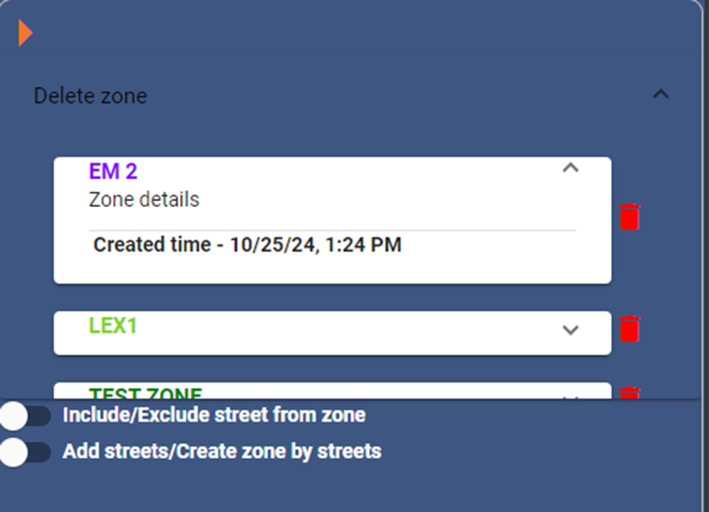 - Note: If you wish to delete any selected streets, click the red trash can icon next to the zone name in the panel.