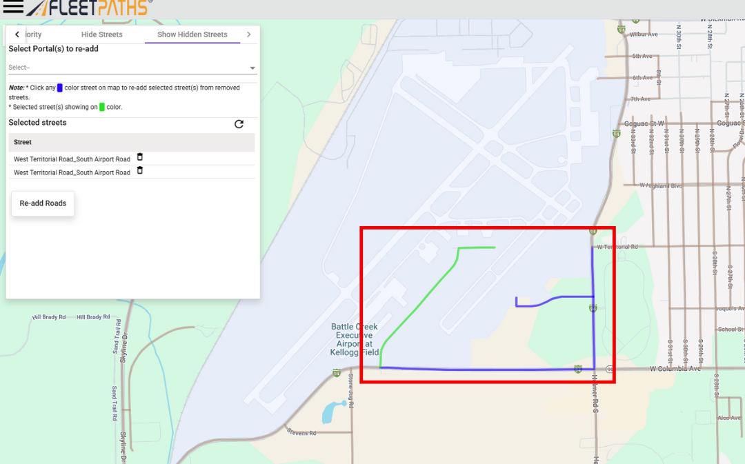 - Once you have selected all the roads you wish to unhide, click the "Re-add Roads" button at the bottom of the left-side menu. This will save your selections and unhide all chosen roads from your map, reinstating tracking and showing vehicle movement on them.