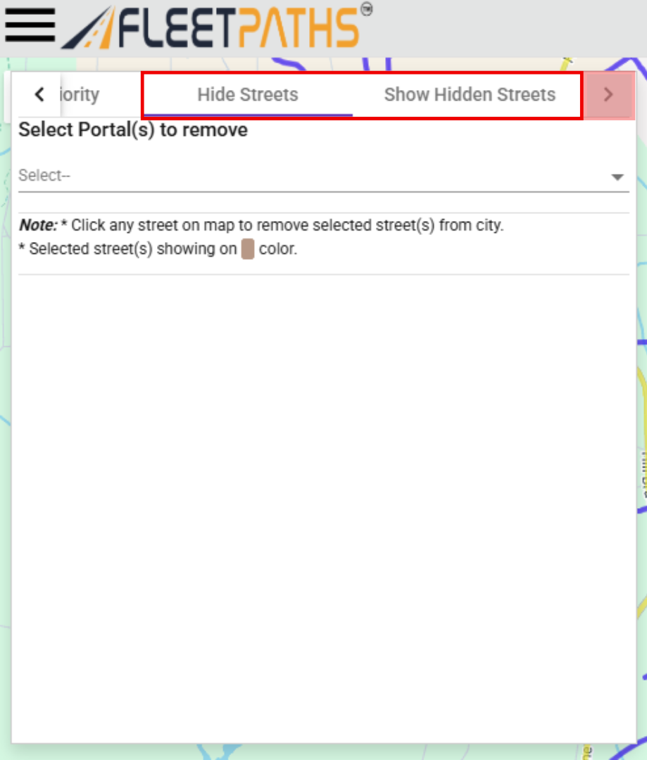 - Before selecting roads to hide, be sure you select which portal to hide them from using the drop-down menu found at the top of the left-side menu.