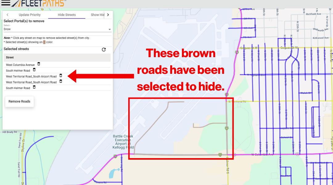 Hiding streets allows you to manually select which roads your vehicles will not appear tracking on. All unhidden roads will track your vehicles moving on them. The ability to hide certain roads is useful for private roads, roads handled by other organizations, etc.