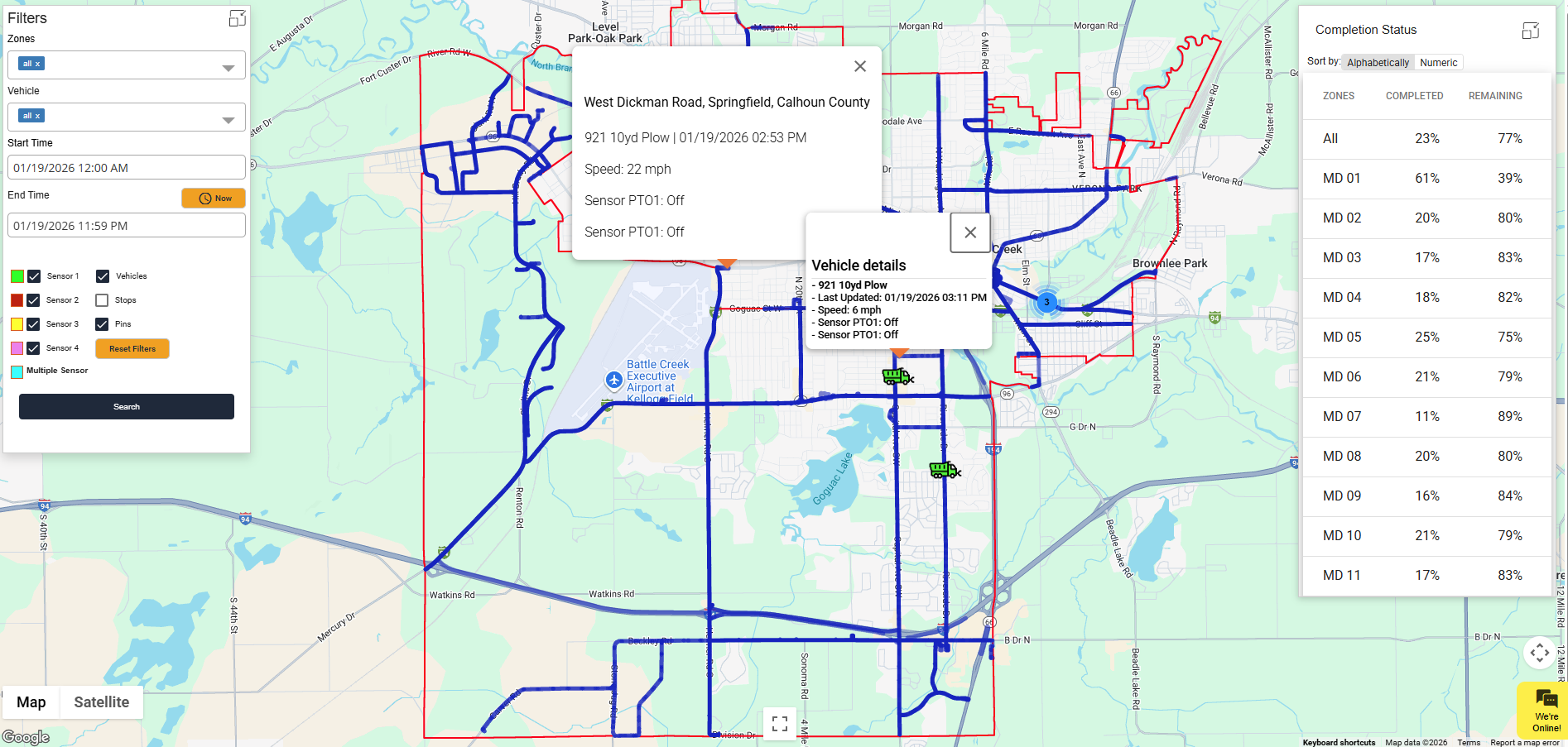 - These two drop-down boxes allow you to choose any time window (up to 24hrs) since account creation and see a historical snapshot of what your vehicles did within the specified timeframe. You will see all vehicle trace lines, Completion Status percentages and any applicable sensor activation that occurred during the timeframe selected.