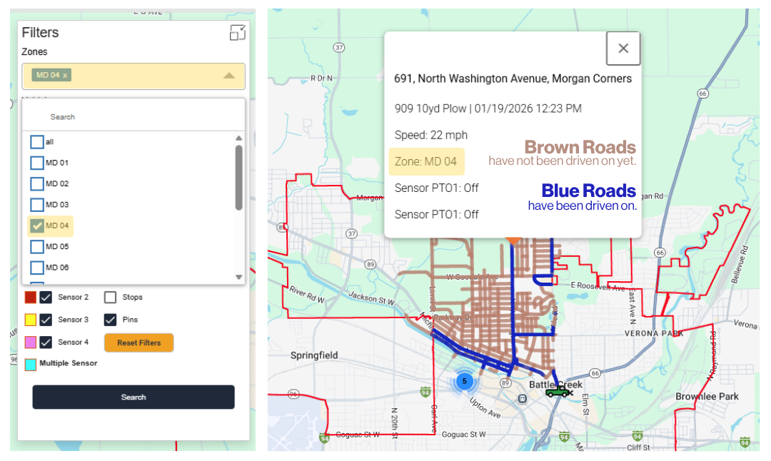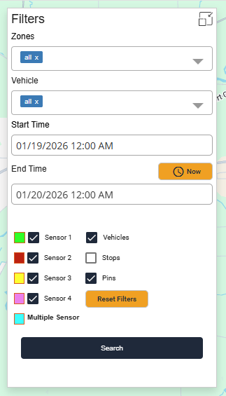 At the very bottom of the Filters menu on the left, you have a column of Sensor Checkboxes. On the right, you have the Vehicles/Stops/Pins Checkboxes. These are all used to select and deselect specific information/icons from being displayed on the map, helping to declutter or more intently target certain information.