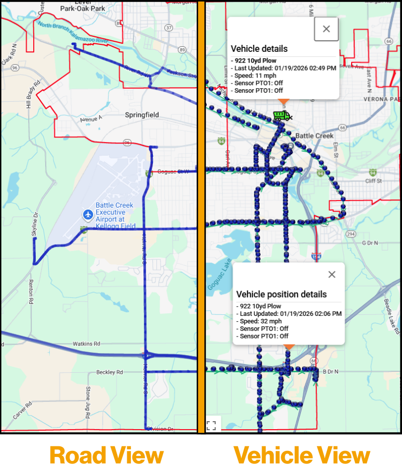 - Vehicle View allows you to access a more granular look into your selected vehicle's movements. The roads these vehicles have driven down will no longer be highlighted blue, instead showing you a point-by-point trace with GPS pings and arrows indicating direction. The GPS ping dots can be clicked on for more detailed information.